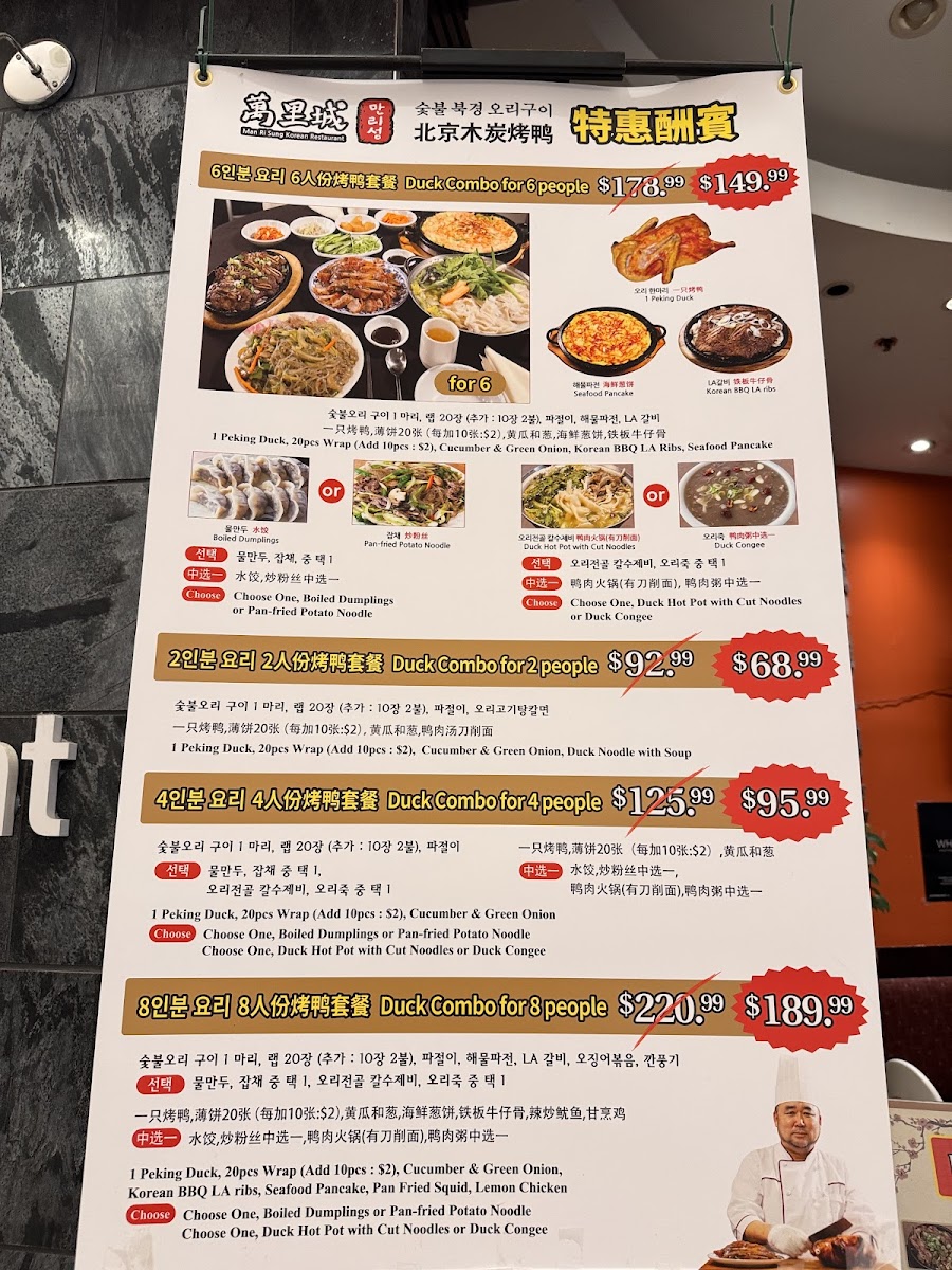 1 Peking Duck, 4 Kinds of Side Dishes, 20pcs Wrap (Add lopes: S2), Cucumber & Green Onion, Korean BBQ ribs, Seafood Pancake, pan Fried Squid, Lemon Chicken Choose One, Boiled Dumplings or Pan-fried Potato Noodle or Rice Sausage Choose One, Duck Hot Pot with Cut Noodles or Duck Congee.